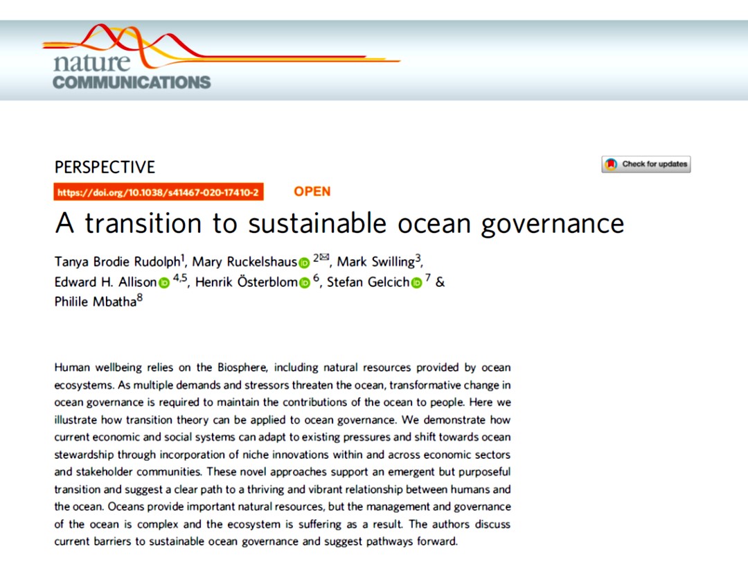 Allison, E.H., Österblom, H., Gelcich, S. & Mbatha, P. A transition to sustainable ocean governance. Nature Communications, https://doi.org/10.1038/s41467-020-17410-2 .
